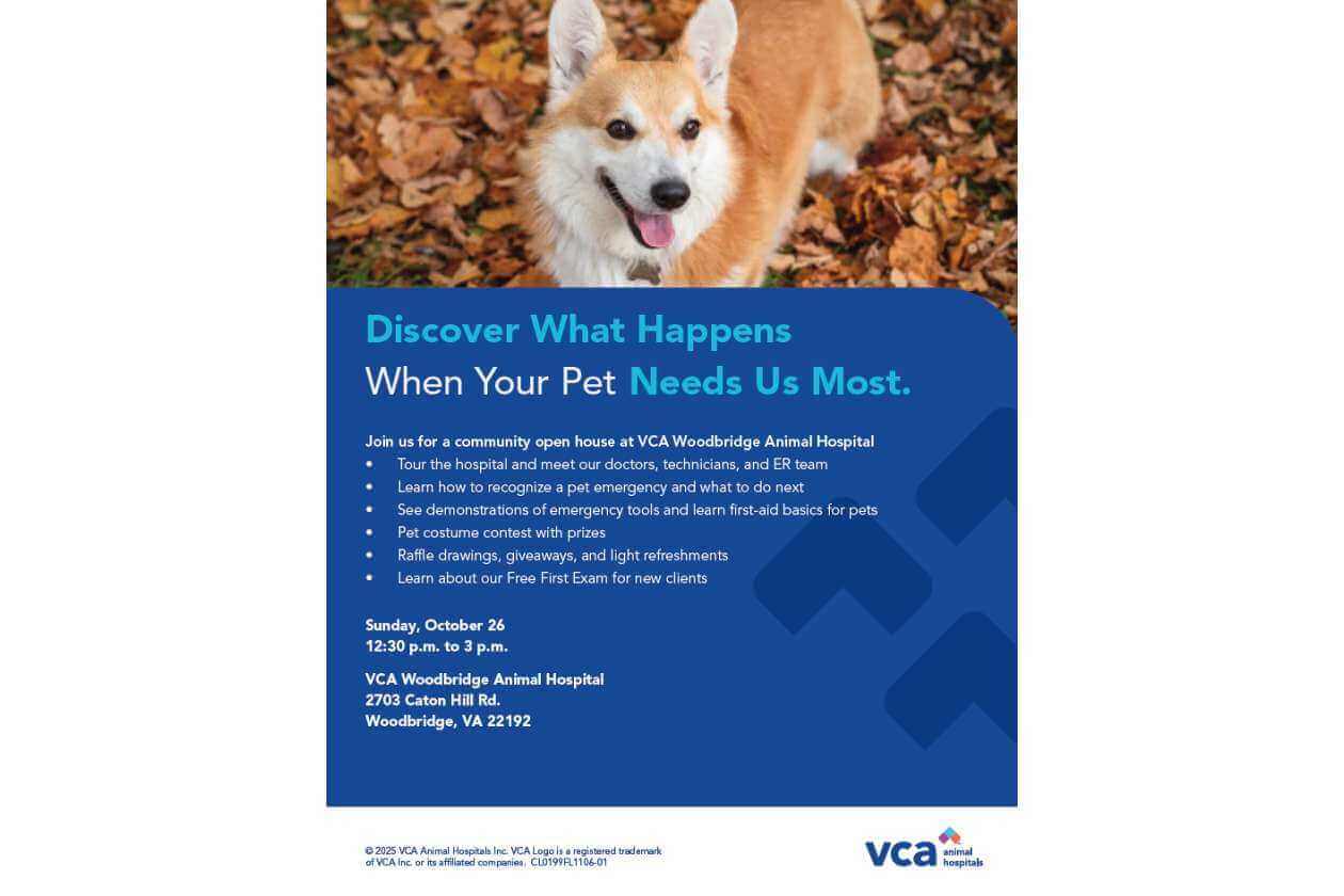 Join VCA Woodbridge Animal Hospital for a family-friendly Open House on Sunday, October 26 from 12:30–3:00 PM. Meet our doctors and ER team, tour the hospital, and see what happens behind the scenes when your pet needs us most. Enjoy educational demos, a pet costume contest, kids’ stuffed animal surgery, raffles, giveaways, and light refreshments. Free to attend — pets and families welcome!