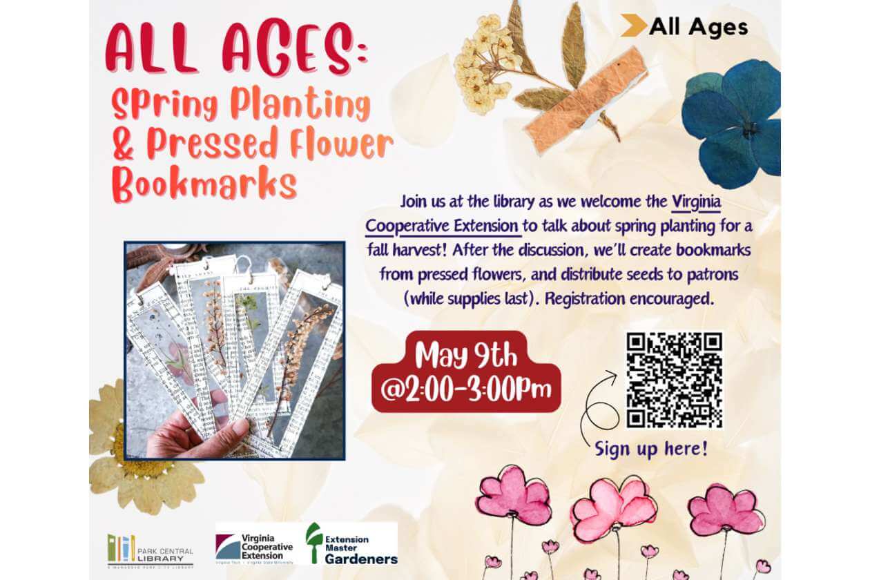 Join us at the library as we welcome the Virginia Cooperative Extension to talk about spring planting for a fall harvest! We’ll create bookmarks from pressed flowers after the discussion, and seeds well be distributed to patrons (while supplies last). Registration Encouraged