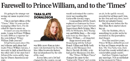 Tara Slate-Donaldson served as the managing editor of the Gainesville Times, and later Prince William Times, for the past 14 years. She filed her final edition of the paper this week and penned a final goodbye to readers that outlines many of the changes seen in Prince William County over year. [Read more]