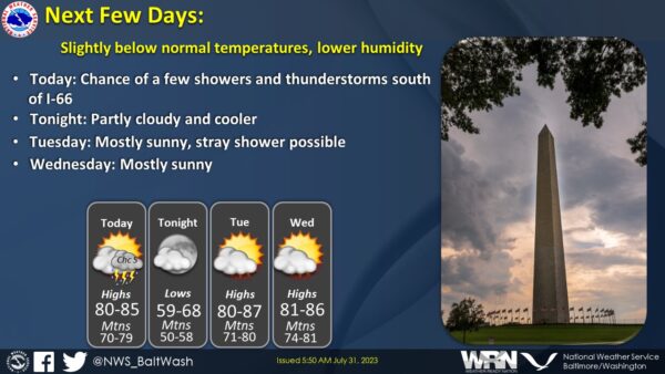 National Weather Service Baltimore-Washington: “A few showers and thunderstorms are possible today and Tuesday. However, most areas will remain dry. Temperatures will remain slightly below normal, and humidity will be relatively low for this time of year.”
