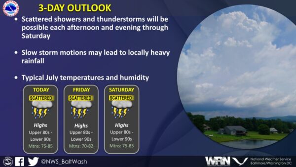 National Weather Service Baltimore-Washington: “Humid but seasonable weather continues today with a little greater coverage of showers and storms this afternoon and evening. Unsettled conditions will continue for the weekend, with Sunday featuring the highest storm chances.”
