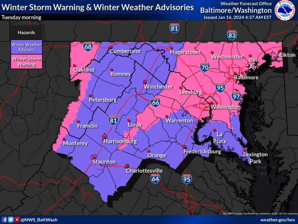 Prince William County Public Schools: “All Prince William County Public Schools will open two hours late Wednesday, January 17, 2024.”