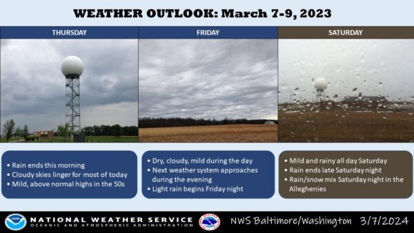 Expect a brief reprieve from wet weather as high pressure takes hold over the Mid-Atlantic states today. According to the latest forecast from the National Weather Service, dry, cool, and breezy conditions will prevail until another low-pressure system approaches over the weekend.