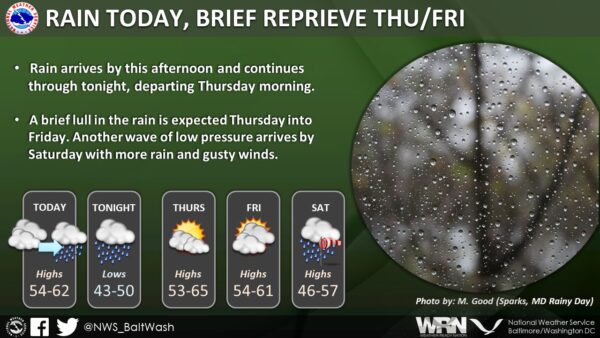 Residents in the Mid-Atlantic region can expect unsettled weather as a low-pressure system tracks up the East Coast, accompanied by a cold front advancing from the Ohio River Valley. According to the National Weather Service, this system will bring a mix of rain, fog, and drizzle to the area through tonight.