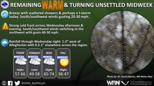 The National Weather Service alerts that a low-pressure system from the Midwest, accompanied by a warm front, is set to sweep through the area, triggering scattered showers and potential thunderstorms. The system is expected to bring scattered showers starting late morning, mainly north of I-66 and US-50, with precipitation becoming more widespread across the area by early afternoon. While the risk of thunderstorms remains low for the day, gusty winds ranging from 25 to 30 mph are anticipated, adding to the atmospheric turbulence.