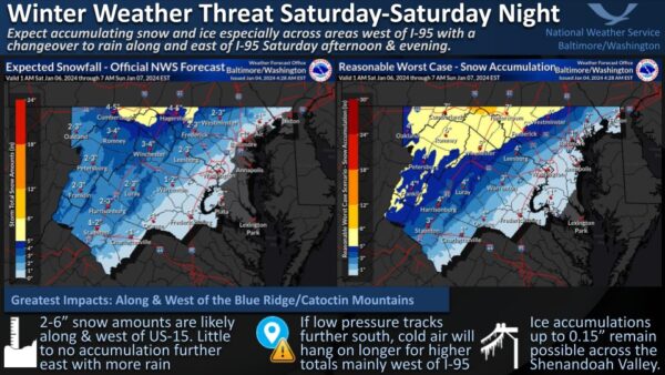 National Weather Service Baltimore-Washington: “Wintry weather is expected across much of the region Saturday to Saturday night. The greatest impacts from snow & ice appear to be in areas along & west of the Blue Ridge, with moderate to heavy rain reducing totals further east. More: http://weather.gov/lwx/winter”