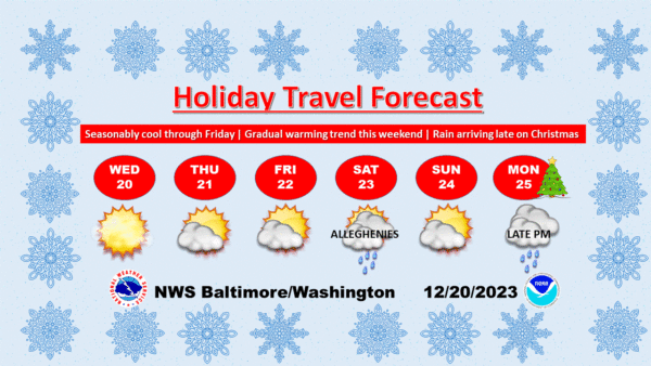 “Dry weather is in store for the next few days. Highs will be in the 40s for most, with 30s in the mountain locales today,” reports the National Weather Service Baltimore-Washington office.