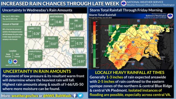National Weather Service Baltimore-Washington: “Shower & thunderstorm chances increase through late week. 1-3″ of rain is expected now-Fri. AM. 2-5″ is expected along the crest of the Blue Ridge as well as central VA. Isolated instances of flooding are possible, especially across central VA Wed. night-Thu”
