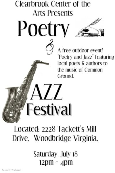 On Saturday, July 18, from noon to 4 p.m. at the Lakeside courtyard in the Tackett’s Mill Center at 2228 Tackett’s Mill Drive in Lake Ridge, The Clearbrook Foundation again presents “Poetry and Jazz”, a free festival featuring local poets and authors reciting to the music of Common Ground, and hosted by Guy Lambert, WPGC radio personality plus surprise celebrities, refreshments, local authors, food trucks and painting station.